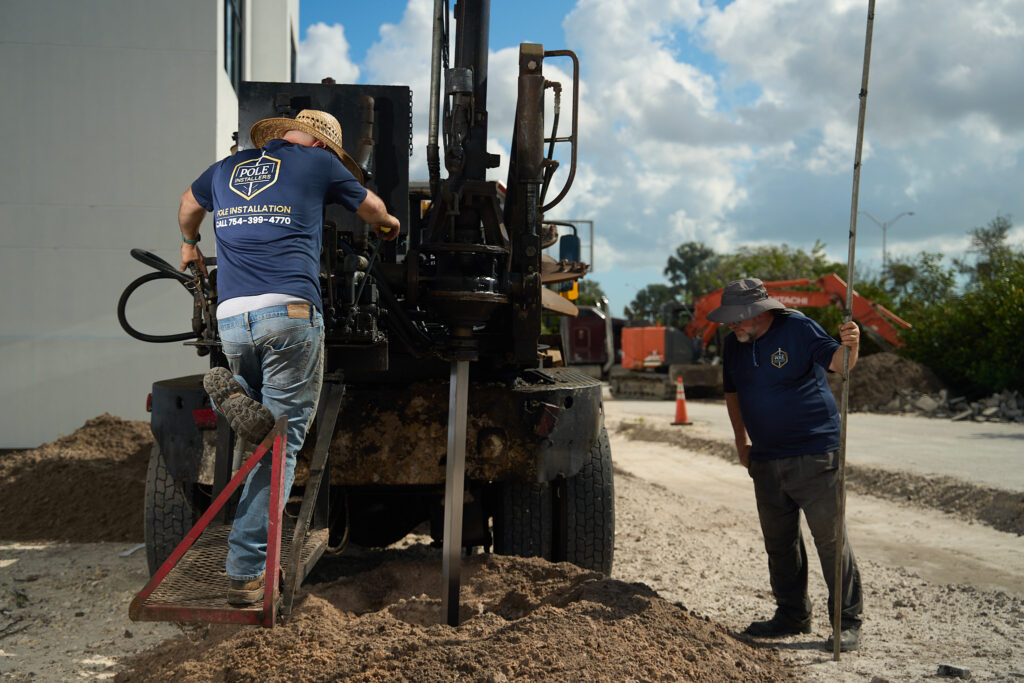 A pylon sign standing 40 or 60 feet above a plaza parking lot is only as stable as the pole holding it up. That pole needs to be engineered for South Florida wind loads, set into a properly sized concrete foundation, and positioned to the exact specifications on the sign company’s drawings. This is structural work that requires the right equipment and a crew that sets poles every day.